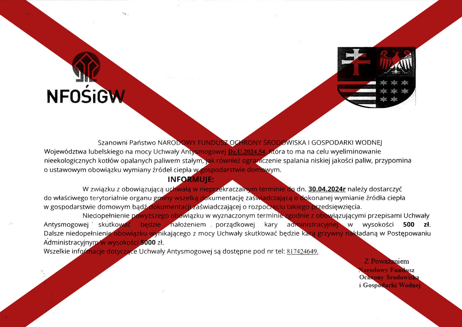 W ostatnim czasie zauważono w kilku gminach województwa lubelskiego fałszywe ulotki. Informacje zawarte w tych materiałach są nieprawdziwe i mogą wprowadzać Państwa w błąd. Prosimy wszystkich Państwa o zachowanie ostrożności i sprawdzania źródeł informacji, zwłaszcza przed podjęciem jakichkolwiek działań na ich podstawie.