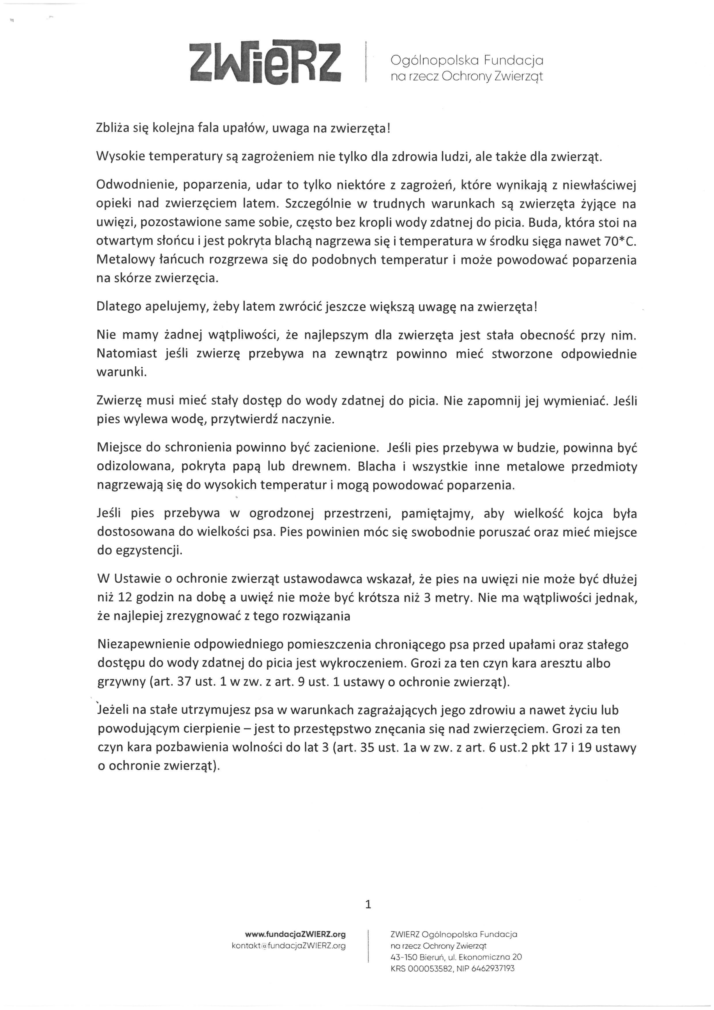 Informacja przesłana przez: ZWIERZ Ogólnopolska Fundacja na rzecz Ochrony Zwierząt ul. Ekonomiczna 20, 43-150 Bieruń
