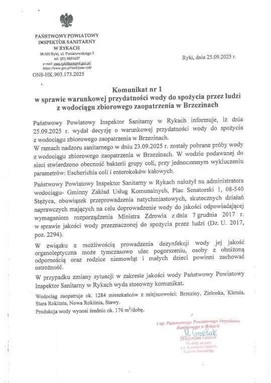 Komunikat w sprawie warunkowej przydatności do spożycia przez ludzi z wodociągu zbiorowego zaopatrzenia w Brzezinach
