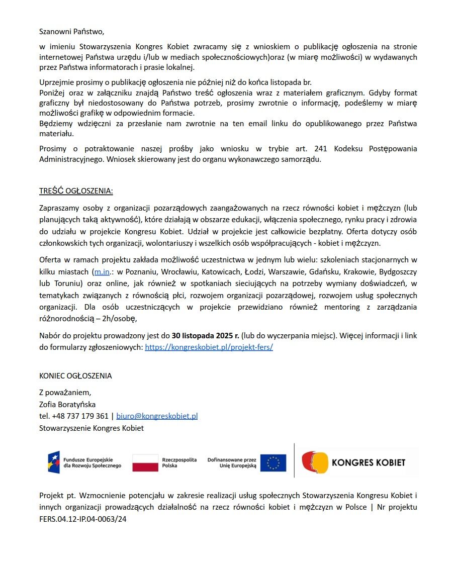Informacja udostępniona na prośbę Zespołu Kongresu Kobiet: