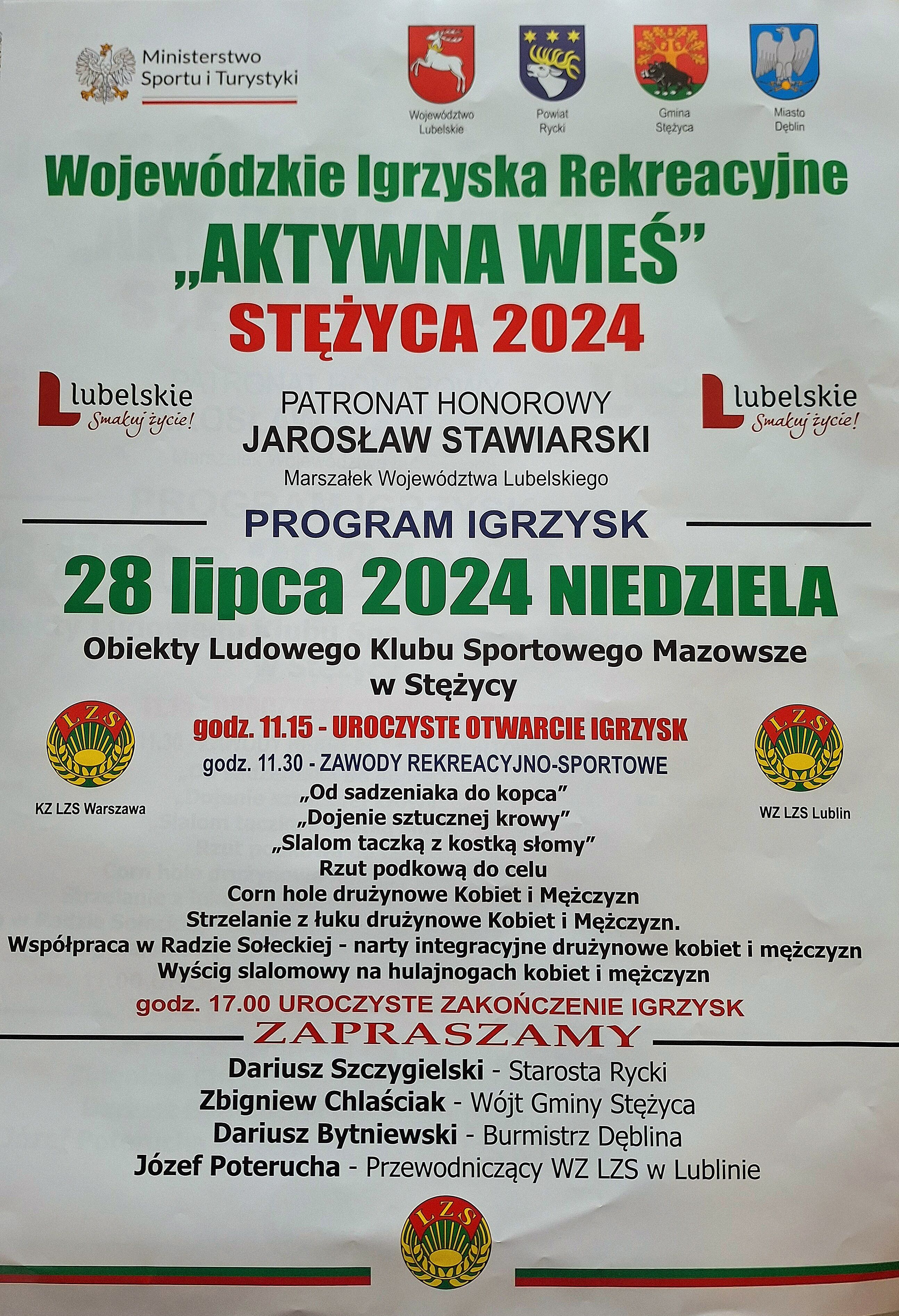 Serdecznie zapraszamy na największe święto sportu na lubelszczyźnie. Potrójna rywalizacja Igrzyskowa w tym roku zagości w powiecie Ryckim – w Stężycy. Igrzyska Rekreacyjno Sportowe LZS, Letnie Igrzyska Seniorów oraz Igrzyska Aktywna Wieś pod Patronatem Marszałka Województwa Lubelskiego – Jarosława Stawiarskiego już 28 lipca!